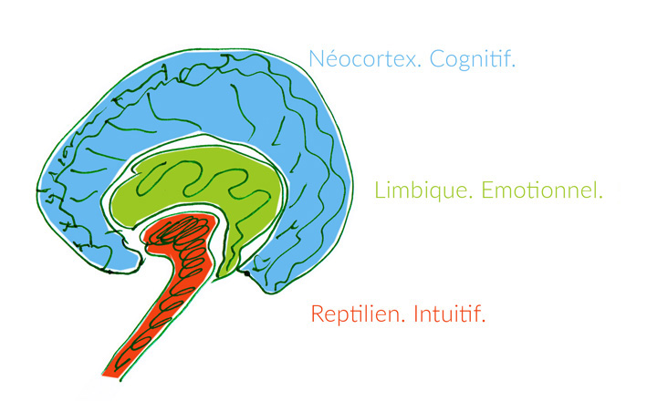 Notre cerveau est divisé en deux hémisphères, le droit et le gauche. La partie gauche produit une pensée linéaire, elle est responsable de la logique et du langage. L’hémisphère droit opère avec des concepts, il est responsable de notre côté intuitif et artistique. Les dernières avancées en neurosciences, subdivisent notre cerveau et ses deux hémisphères encore en 3 parties, imbriquées l’une dans l’autre.