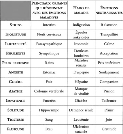 Massaru Emoto dans son livre L’eau, mémoire de nos émotions nous décrit des cas cliniques de guérisons grâce aux déchiffrages des émotions enfouies. Il nous propose une liste des émotions qui créent la maladie et des émotions qui la neutralisent.